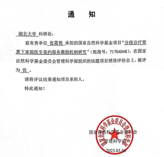 近日,接国家自然科学基金委员会管理科学部通知,由我院张霄艳教授主持的国家自然科学基金项目“分级诊疗背景下家庭医生签约服务激励机制研究”(批准号:71704048)在国家自然科学基金委员会管理科学部组织的结题项目绩效评估会上被评为“优”。