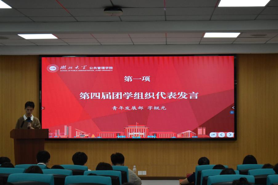 会议伊始,第四届团学组织代表字概光发言,他总结一年以来的工作心得,回顾了团学组织成员孜孜不怠、圆满完成各项工作的经历,并对新一届团学组织成员寄予期望。