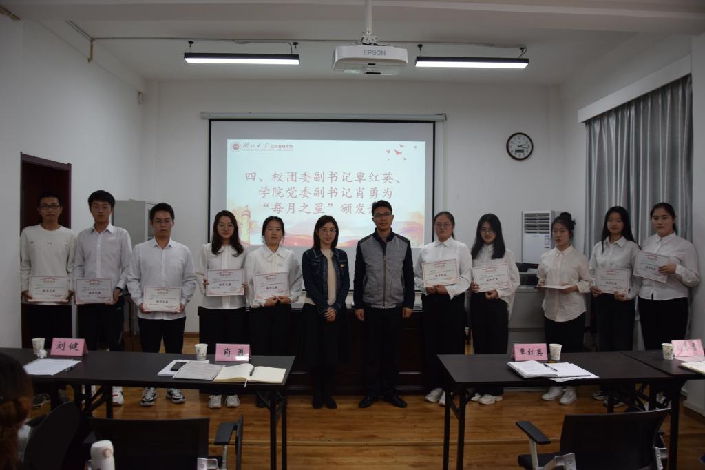 大会总结回顾团学组织前期工作,以视频播放的形式充分展示我院团学组织风采。学院团委书记刘健宣读“每月之星”表彰文件,校团委副书记覃红英、院党委副书记肖勇为10月份各部门表现优异者颁发“每月之星”证书。获奖代表李培源、杨季鲜在会上分享自己的工作心得和体会,两位同学的分享不仅体现了个人积极务实、勤恳负责的工作态度,还代表着学院团学组织团结和谐、奋发向上的精神面貌。