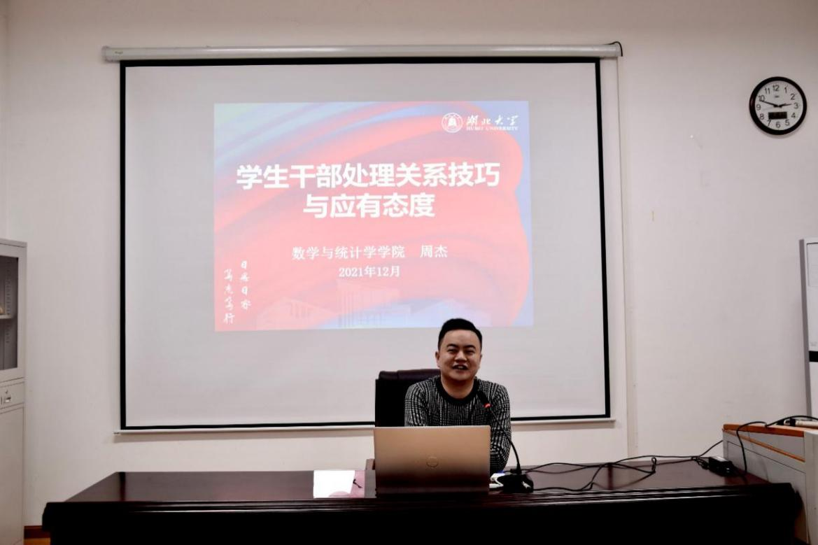 最后数学与统计学院团委书记周杰为全体学生干部作专题报告。周杰老师以“学生干部处理关系技巧与应有态度”为主题,围绕学生干部的自我认识和定位、学生干部需要改进的问题、学生干部应妥善处理的几种关系以及学生干部应具备的工作态度进行展开论述。周杰老师着重指出,学生干部在处理各类关系的过程中,应该将尊重放在首要地位,建立良好的沟通条件,以真诚开放的态度处理关系中的各类矛盾。