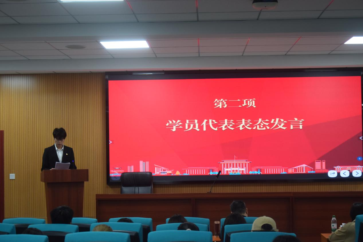 随后学员代表上台发言,郑重表达了全体学员向党组织靠拢的坚定决心与奋进姿态。他表示,全体学员将以此次培训为契机,潜心钻研党的创新理论,自觉锤炼政治品格,在理论学习中坚定理想信念,在日常实践中践行初心使命,努力成为同学们身边的先锋模范。