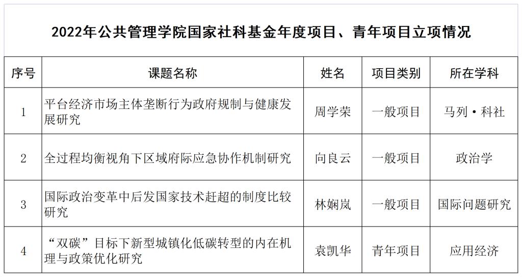 我院本次获立项公示的国家社科基金项目包括一般项目3项,青年项目1项,分别为周学荣教授申报的《平台经济市场主体垄断行为政府规制与健康发展研究》、向良云副教授申报的《全过程均衡视角下区域府际应急协作机制研究》、林娴岚副研究员申报的《国际政治变革中后发国家技术赶超的制度比较研究》、青年教师袁凯华老师申报的《“双碳”目标下新型城镇化低碳转型的内在机理与政策优化研究》。此次立项项目涉及学科涵盖马列·科社、政治学、国际问题研究、应用经济,进一步彰显了我院教师的学术水平和跨学科研究能力,也是我院在人文社科相关领域科研实力的又一次集中体现。