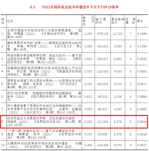 近日,由中国社会科学院世界经济与政治研究所编撰的《世界经济年鉴》发布了2021年世界经济学最佳论文TOP10榜单,我院林娴岚副教授在《世界经济与政治》2021年第12期发表的论文《技术民族主义与美国对苏联、日本的高技术遏制》入选“2021年国际政治经济学最佳中文论文TOP10榜单”。