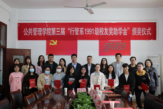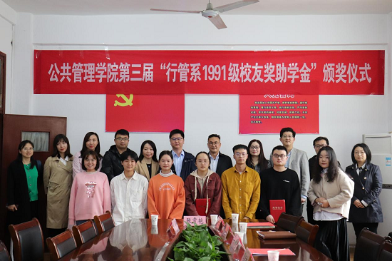 4月14日下午,伟德国际1946源于英国在3楼会议室举行第三届“行管系1991级校友奖助学金”颁奖典礼。行管系1991级校友代表、湖北省广发银行古田支行行长周新敏、行政管理系教师李荣娟、周鸿雁,学院领导班子、行政管理系教师代表以及全体获奖学生参加,院长陈荣卓主持。