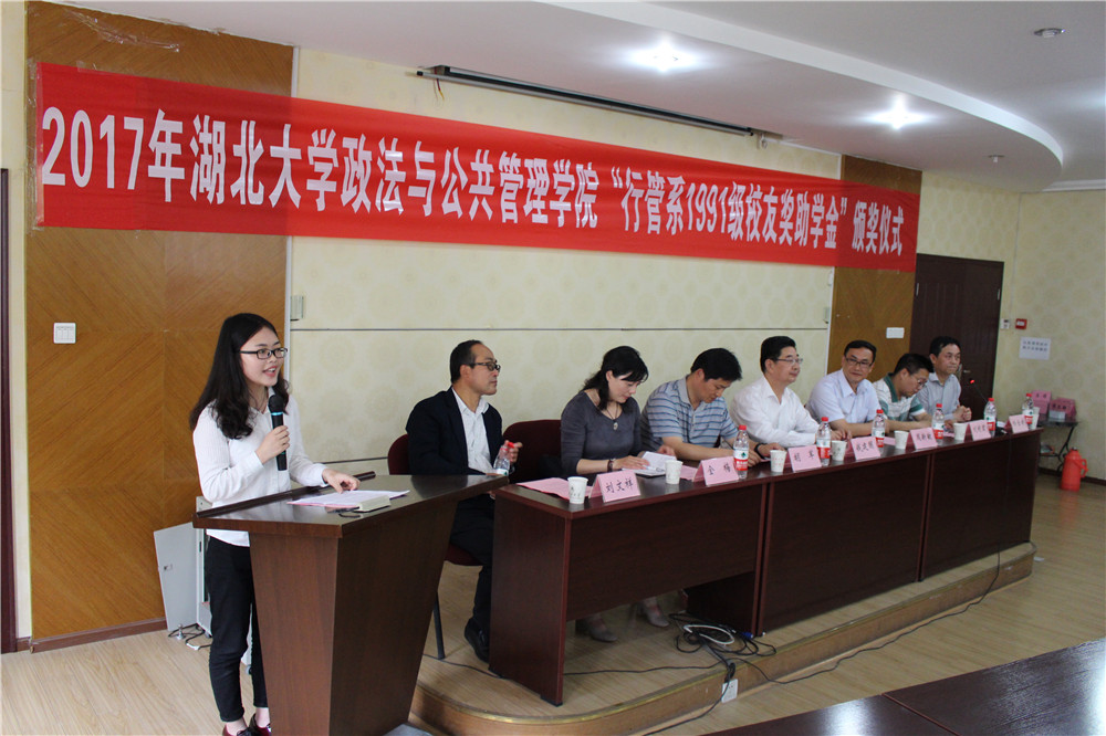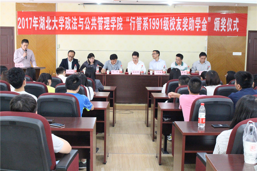 (通讯员:谭伟)5月10日下午,伟德victor1946政法与伟德国际1946源于英国“行管系1991级校友奖助学金”颁奖仪式在逸夫楼C座二楼MBA阶梯教室举行,伟德victor1946副校长钱建国,行管系91级校友代表广发银行武汉分行资产管理部总经理周新敏、校研究生院培养处处长胡军、校合作发展处处长金梅,校学生工作部(处)处长刘靖君、学院党委书记郑全新、院长刘文祥出席会议,学院获奖学生及部分学生代表参加会议,会议由学院党委副书记袁新主持。