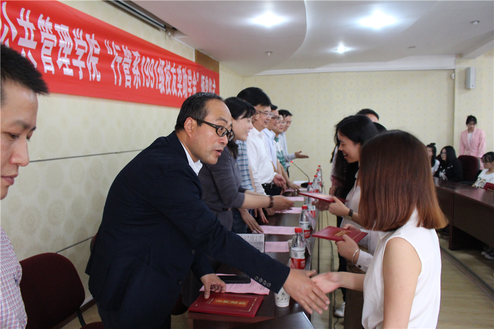 随后,郑全新书记宣布获奖学生名单,戴红利等15名同学获得“行管系1991级校友奖助学金”。
